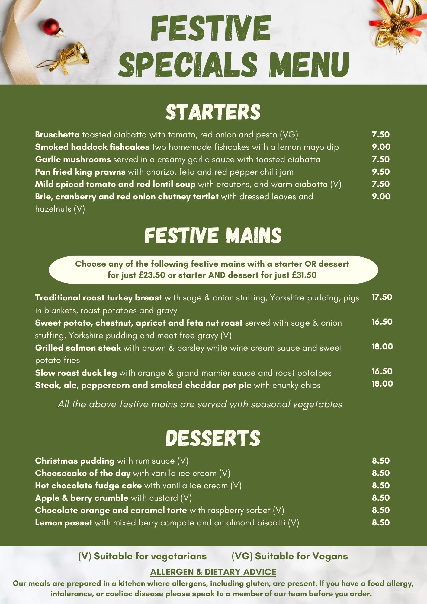 In addition we will be offering a standard main menu (this will be a reduced version of our normal menu). Starters and desserts from the festive menu can be chosen with mains from this menu but just won’t be included in any special offer.